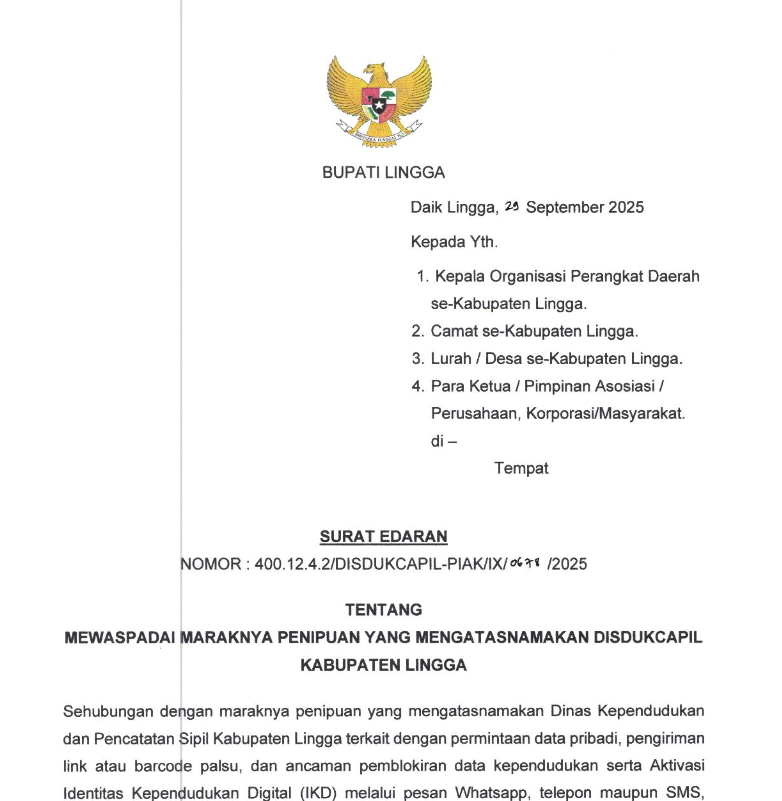 Sehubungan dengan maraknya penipuan yang mengatasnamakan Dinas Kependudukan dan Pencatatan Sipil Kabupaten Lingga terkait dengan permintaan data pribadi, pengiriman link atau barcode palsu, dan ancaman pemblokiran data kependudukan serta Aktivasi Identitas Kependudukan Digital (IKD) melalui pesan Whatsapp, telepon maupun SMS, disampaikan untuk lebih berhati-hati dan waspada terhadap modus penipuan tersebut. Berkaitan dengan dasar tersebut diatas, terlampir Surat Edaran Bupati Lingga.